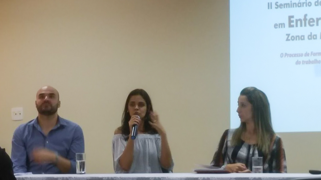 O coordenador do Curso de Enfermagem da UFJF Prof. Dr. Thiago César Nascimento e a coordenadora do Curso de Enfermagem da Universidade Salgado de Oliveira de JF, Fabíola Lisboa da Silveira Fortes também compuseram a mesa que teve como objetivo a discussão sobre a formação do enfermeiro.