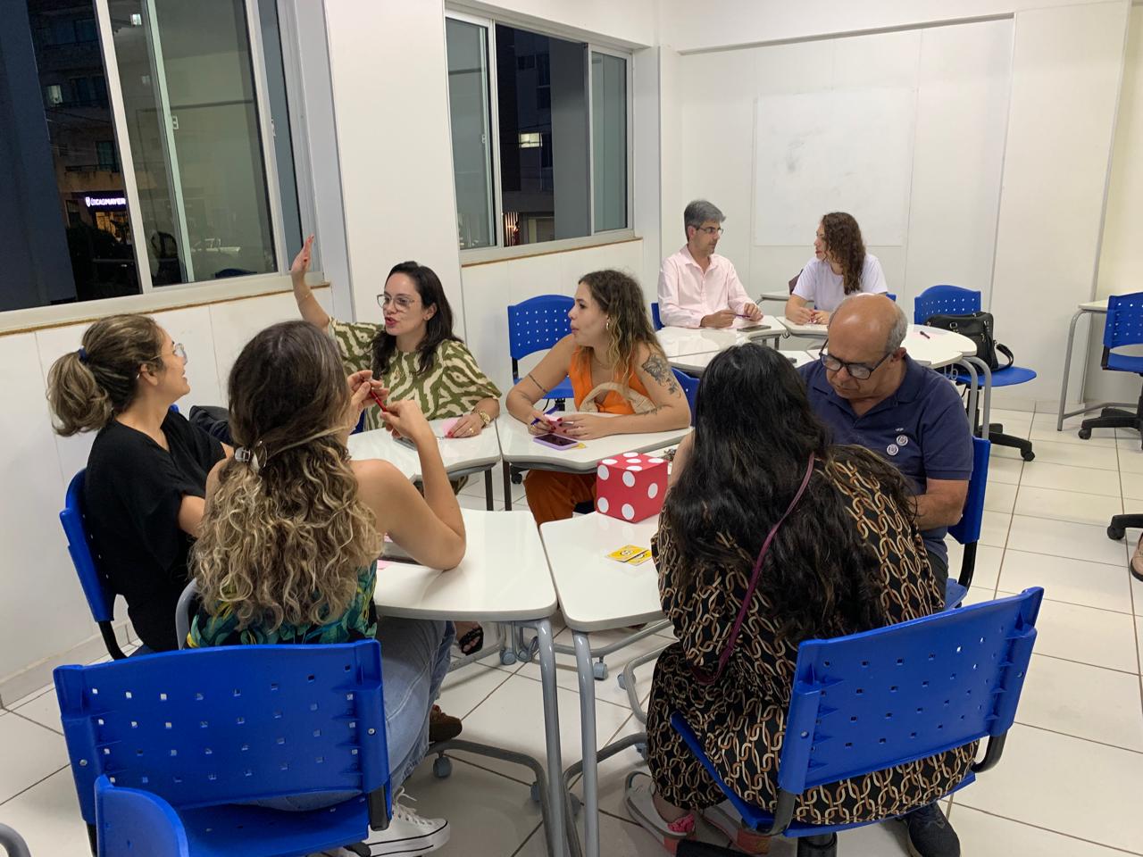 Também foram explorados o Jogo Verdadeiro-Falso-Discussão, no qual os docentes responderam a questões sobre os conteúdos apresentados e debateram as respostas, utilizando um tabuleiro próprio e o jogo de dados, e o Think-Pair-Share, em que os participantes refletiram individualmente, compartilharam ideias com um colega e depois discutiram com o grupo. Além disso, os professores elaboraram sínteses concisas sobre os temas abordados por meio da estratégia One Minute Thesis.
