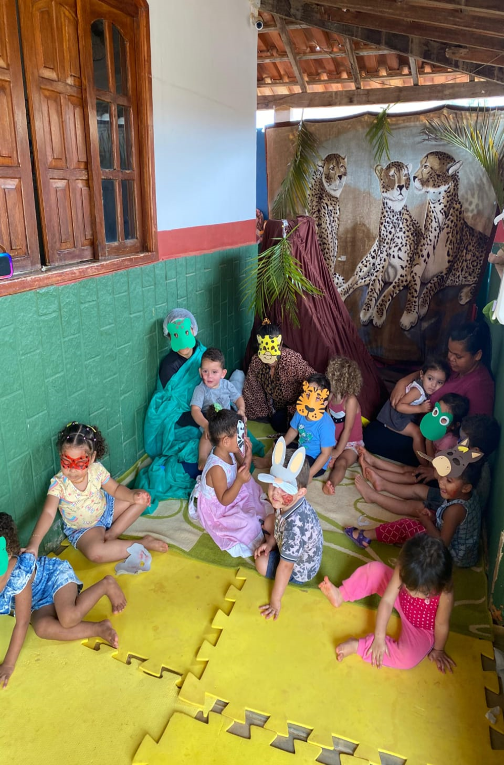 No segundo dia, com o apoio de funcionários da creche, foi encenado o teatro “A Onça Doente”, no qual as crianças se tornaram os próprios personagens, escolhendo máscaras dos animais que mais gostavam para a encenação. A atividade proporcionou momentos de alegria e aprendizado, destacando a importância do cuidado com os animais.