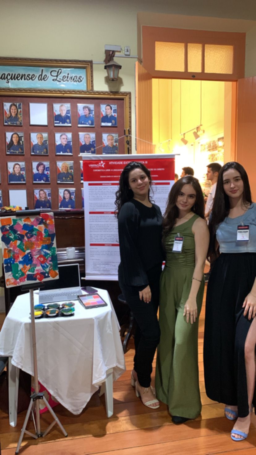 O projeto “Chromática Juris: a linguagem das cores na representação do Direito”, desenvolvido pelas alunas Letícia Alvim, Giovana Corrêa e SherMoreira, trouxe uma   abordagem criativa para compreender a percepção dos jovens de Manhuaçu sobre o Direito. A iniciativa, orientada pela professora Marina Quirino Itaborahy, foi apresentada no dia 22 de novembro de 2024, na Casa de Cultura de Manhuaçu, como parte da disciplina Atividade Extensionista III do curso de Direito do UNIFACIG.