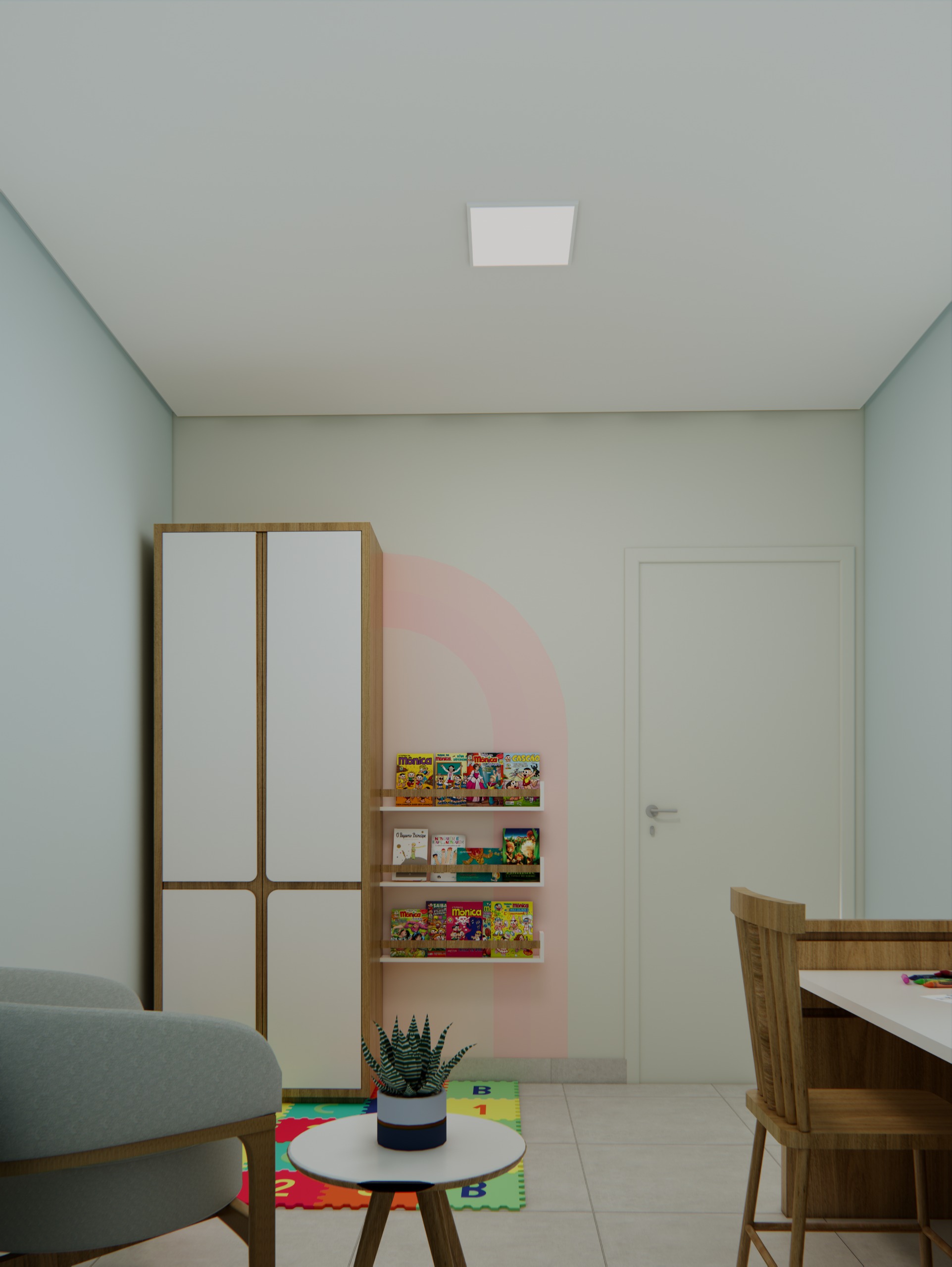 O projeto se destaca pela integração de conhecimentos de arquitetura e fonoaudiologia, com a escolha cuidadosa de cores, iluminação e mobiliário. A paleta selecionada combina tons neutros de azul e rosa em nuances pastel, visando minimizar a sobrecarga sensorial. Além disso, a iluminação quente foi preferida à luz branca, criando uma atmosfera mais calma e relaxante.