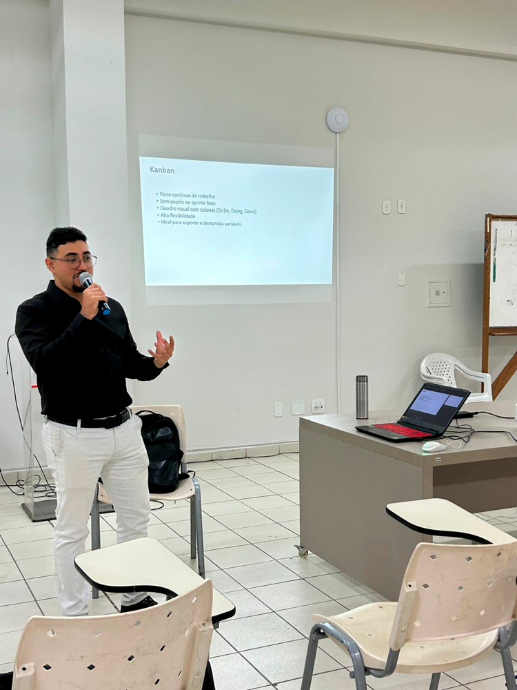 Para solidificar o aprendizado e demonstrar a teoria em ação, um estudo de caso e um exemplo real foram cuidadosamente discutidos. A sessão culminou com dicas valiosas para a carreira dos estudantes e orientações práticas sobre como aplicar os princípios da gestão de projetos desde o início de suas jornadas. Ao final, um espaço produtivo e dinâmico foi dedicado para dúvidas e troca de ideias, permitindo um diálogo direto e esclarecedor entre o palestrante e os participantes.