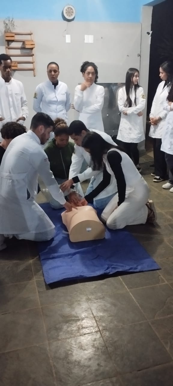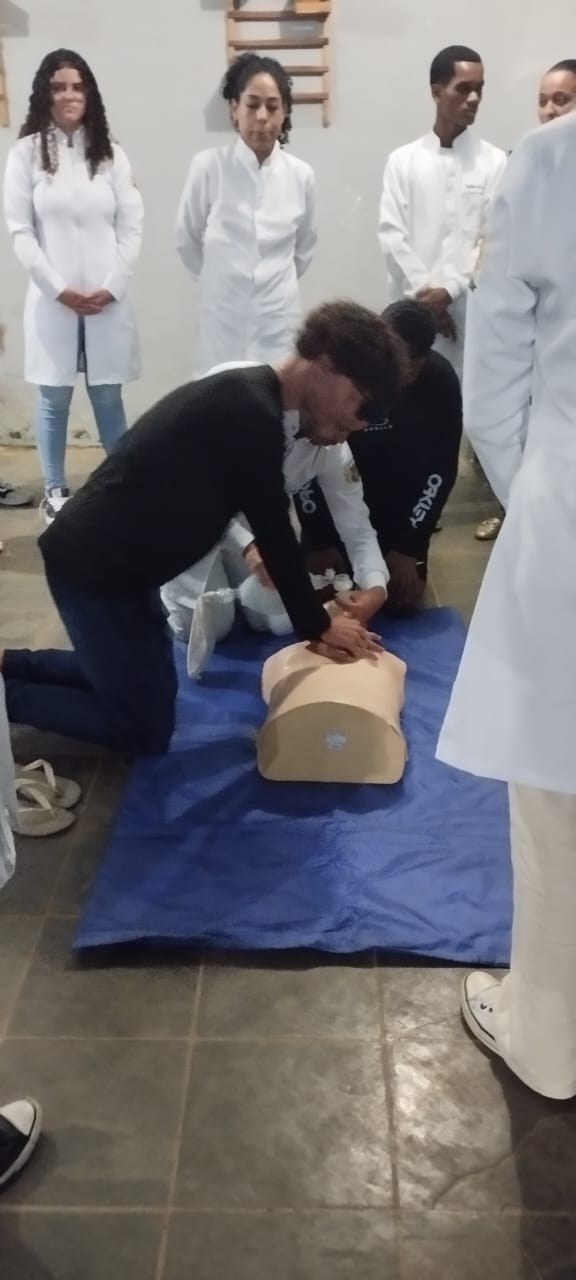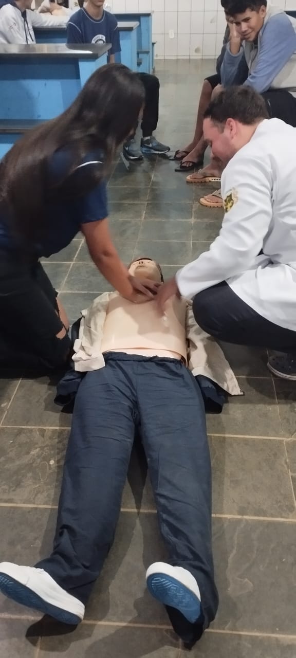 No encontro, os estudantes da escola puderam aprender e praticar procedimentos como compressões cardíacas, manobras de desobstrução das vias aéreas e outras técnicas fundamentais de suporte básico à vida.