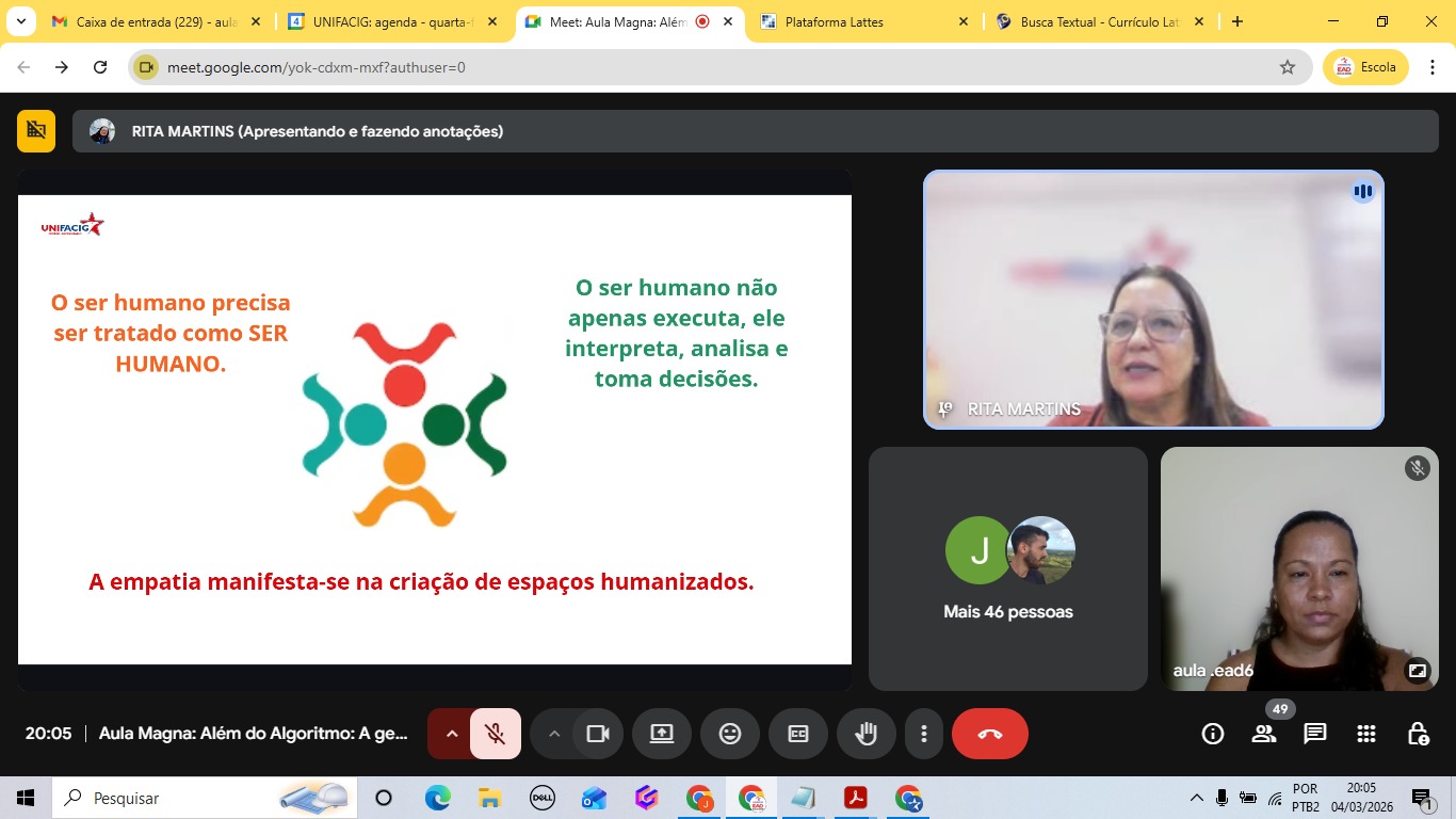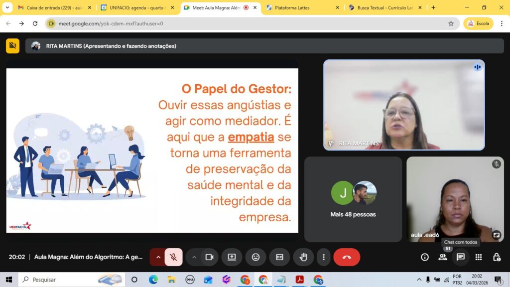 No dia 04 de março, o UNIFACIG Digital promoveu uma Aula Magna que uniu reflexão, tecnologia e humanização nas relações de trabalho. Com o tema “Além do Algoritmo: a Gestão como Território da Empatia”, a palestra foi conduzida pela professora Dra. Rita de Cássia, que trouxe importantes provocações sobre o papel da liderança em um mundo cada vez mais marcado pela automação e pela inteligência artificial.