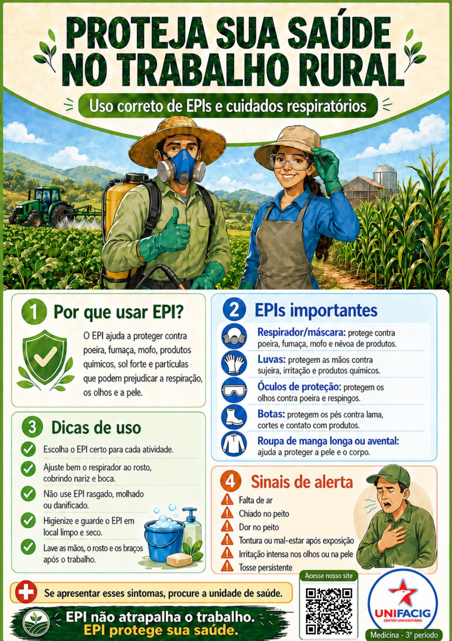 Paralelamente, a Prof. Dra. Maria Larissa Bitencourt Vidal promoveu orientações voltadas à saúde respiratória, abordando os impactos ambientais e ocupacionais, especialmente relacionados à atividade agrícola, como a exposição à poeira durante a colheita do café.