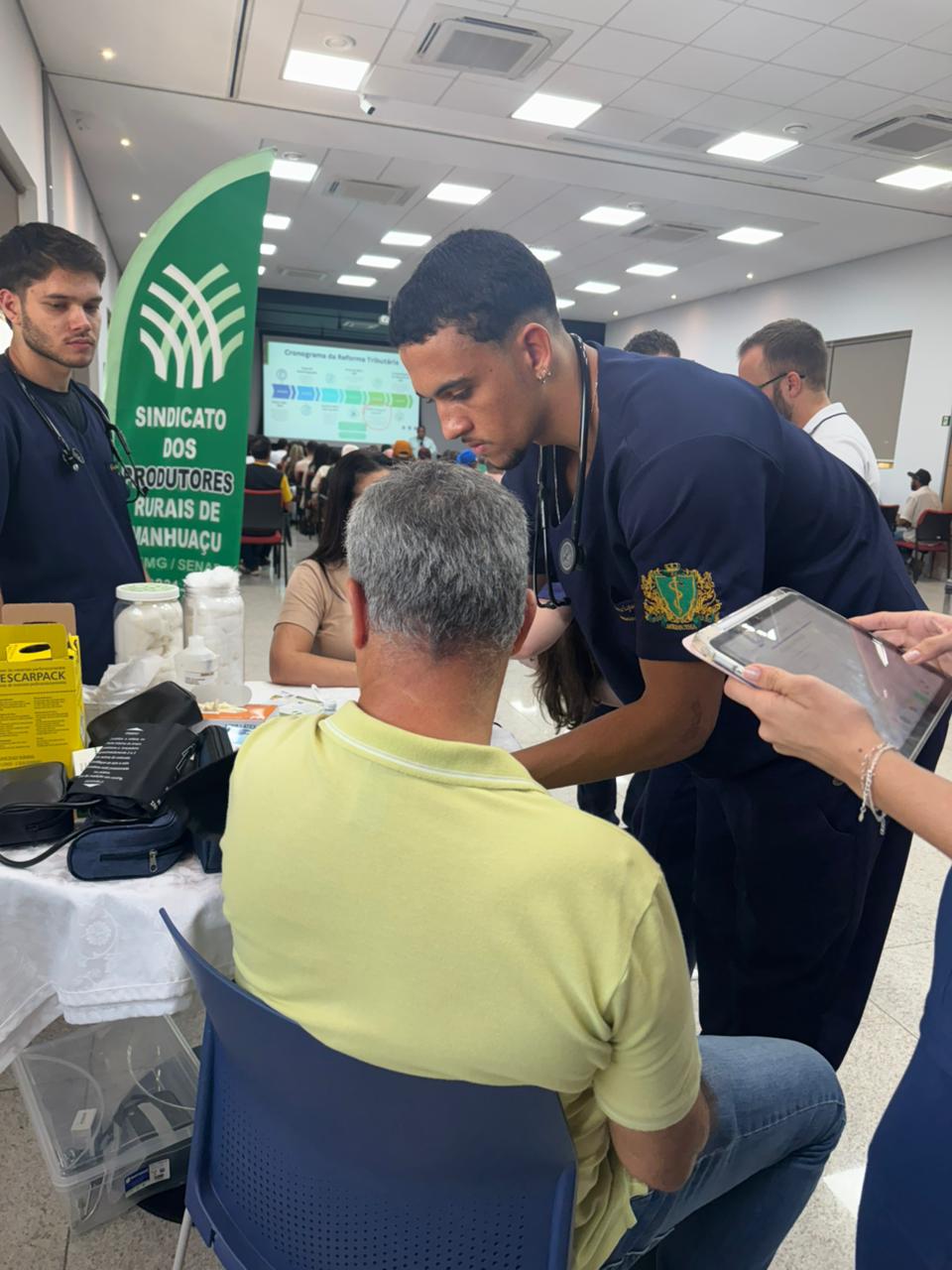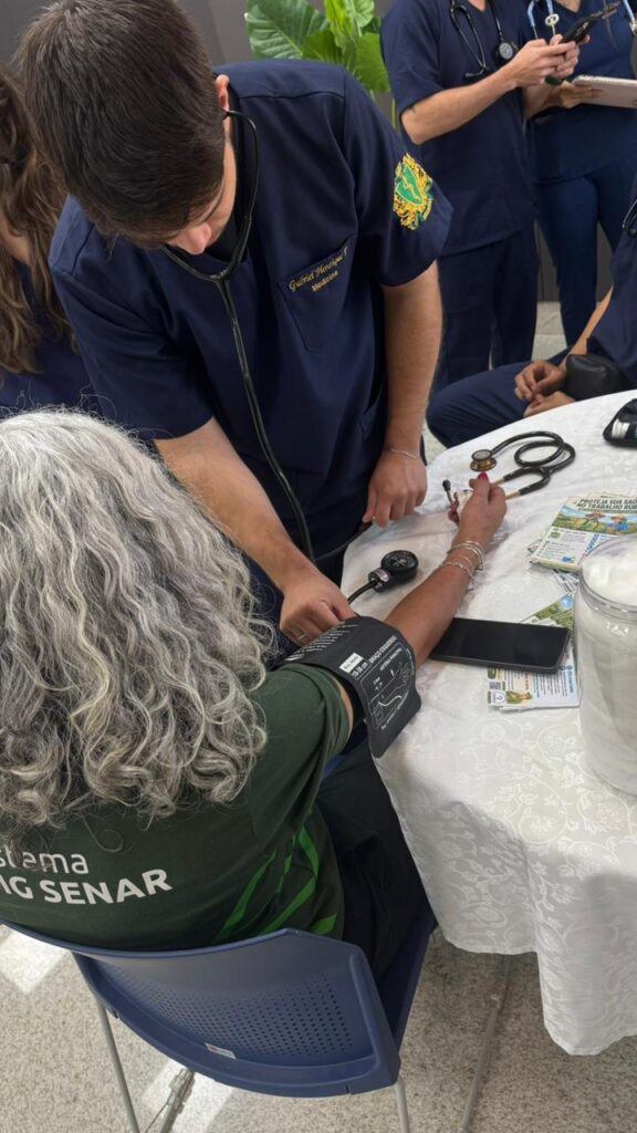 Durante a ação extensionista, os acadêmicos prestaram assistência técnica em saúde, realizando procedimentos como aferição de pressão arterial, testes de glicemia capilar e verificação da saturação de oxigênio (oximetria de pulso). As atividades foram conduzidas sob supervisão do Prof. Rafael Onibene, garantindo qualidade técnica e segurança no atendimento.